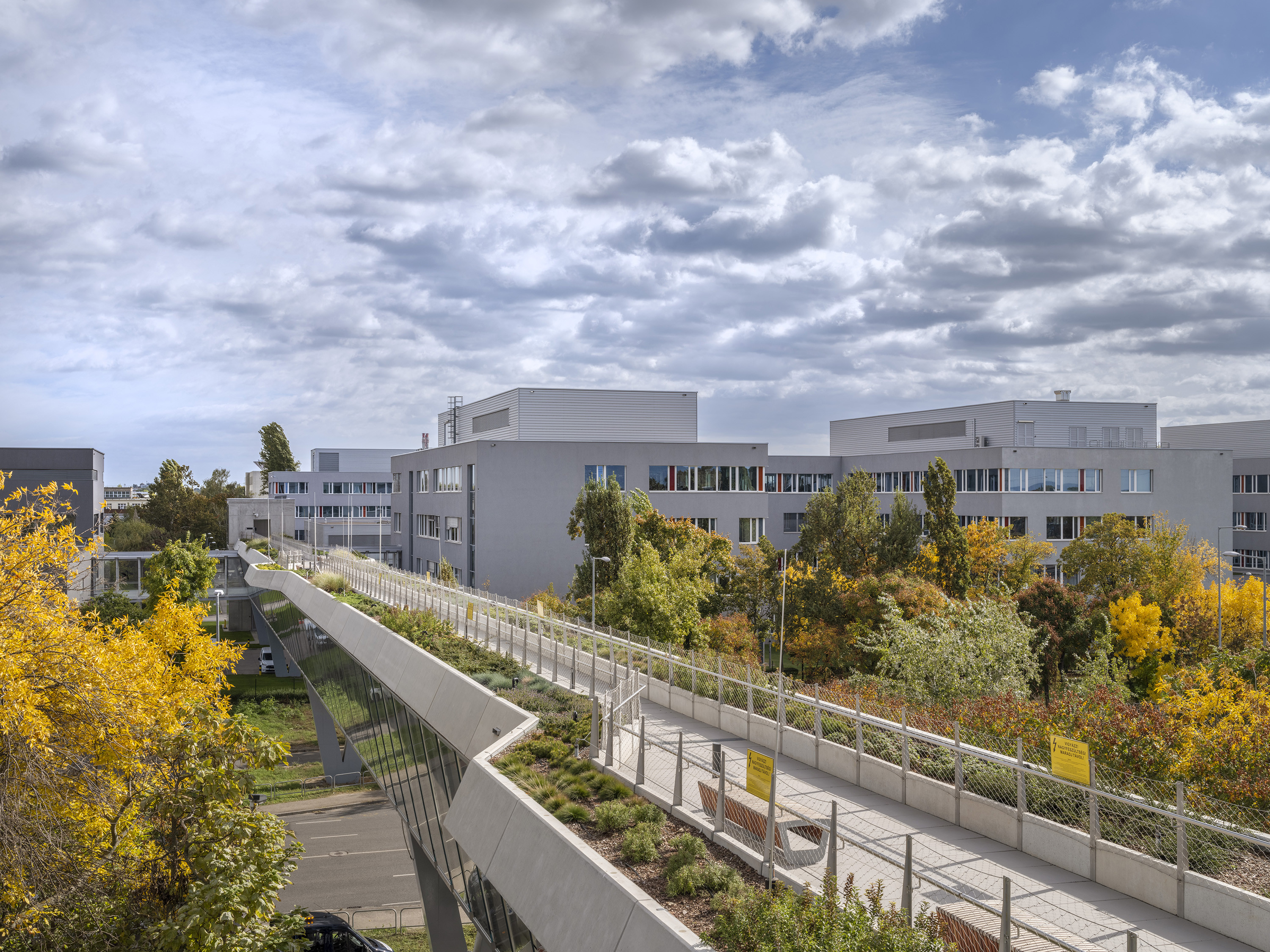 A zöld szabadtéri összeköttetésen felül szükség volt egy védett útvonal létrehozására is, mely biztosítja a laborberendezések időjárásvédett mozgatását is a két Campus között. Így formálódott a kétszintes „V" keresztmetszetű híd koncepciója, mely egy szélesebb felső, zölddel beültetett pályalemezből és egy keskenyebb, zártabb alsó pályalemezből áll.